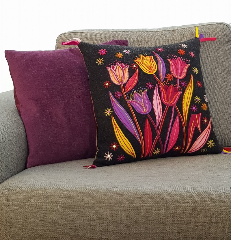 Bottentyget är vadmal, och applikationer och broderier är ullfilt och garn i ren ull. Innerkudde med dun/fjäderfyllning, baksida i randvävt bomullstyg.