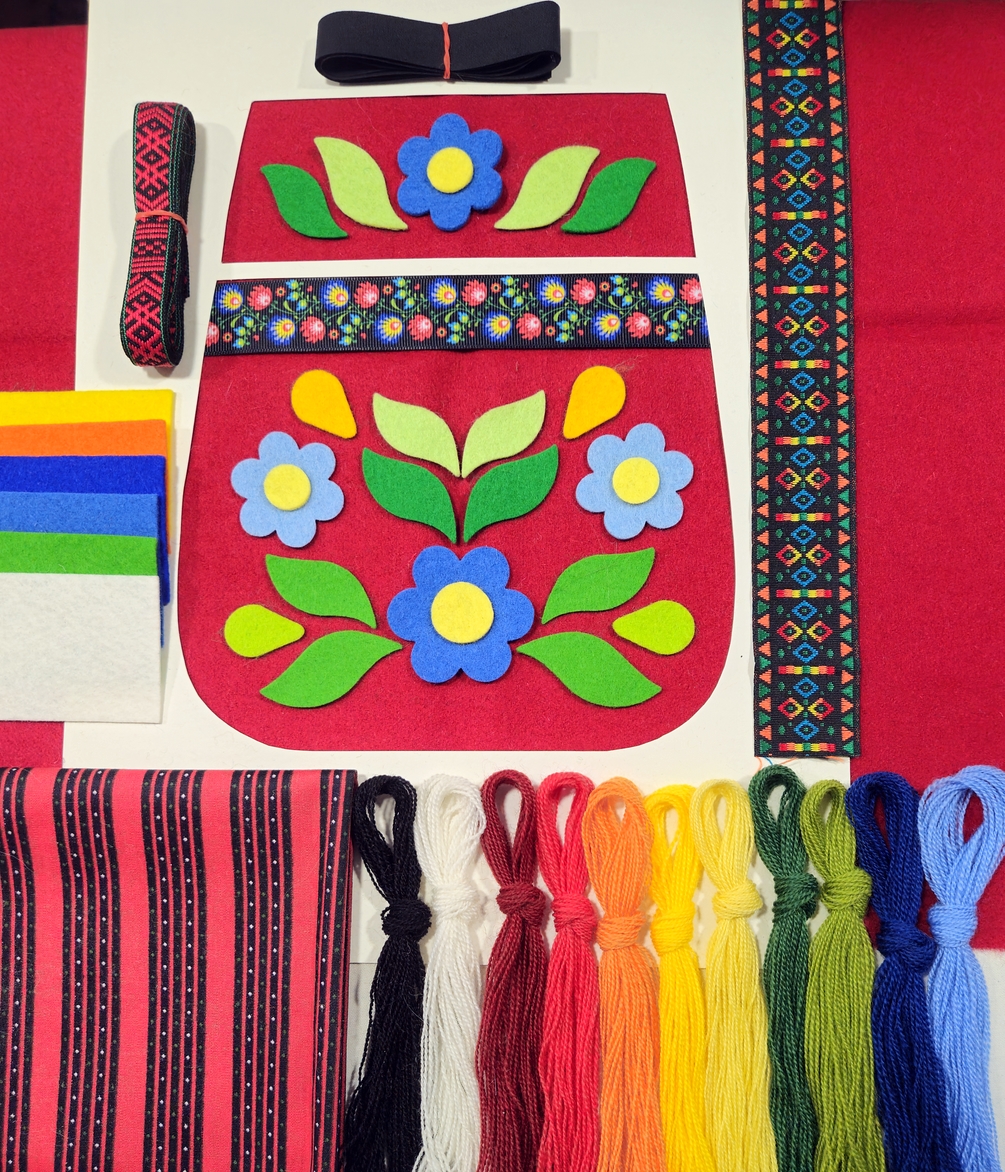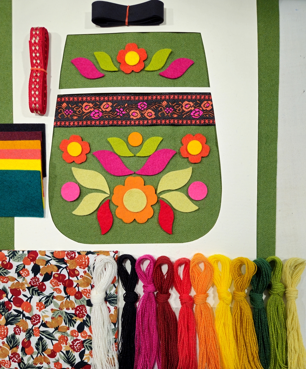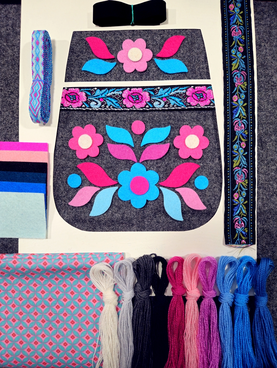 Varje sats innehåller bottentyg (vadmal, fast kläde etc), bomullstyg till foder för både bak- och framstycke, stansade ullfiltsformer till applikationer, sex extra bitar ullfilt för egna mönsterkompositioner, garn (ca 160 trådar redgarn 20/2 i ull eller alpacka), 150 cm vävt allmogeband till axel/midjeband, ett kantband och en eller två bitar bredare dekorband att lägga in i mönstret. Jag skickar även med en påse blingbling med pärlor, paljetter, rhinestones m.m. Självklart ingår mönster och sömnadsbeskrivning.