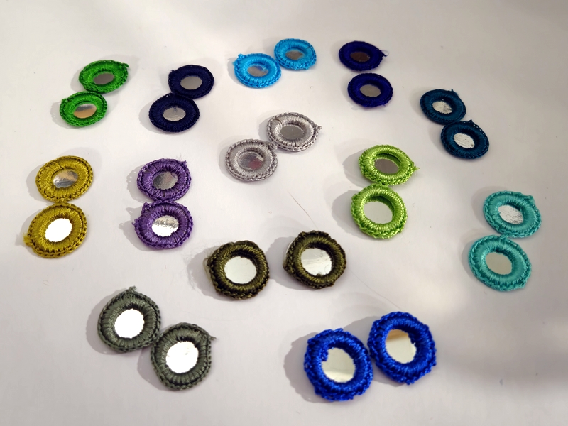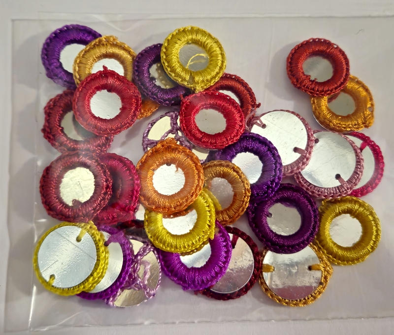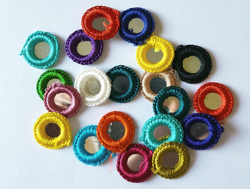 Små indiska akrylspeglar med virkad kant, färdiga att sy fast på broderier eller plagg. Ca 18 mm i diameter. Säljs i påsar med 20 st blandade färger i varje eller 10 st i samma färg.