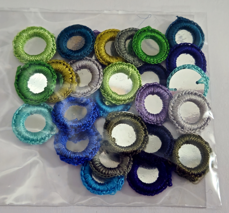 Små akrylspeglar med virkad kant, färdiga att sy fast på broderier eller plagg. Ca 18 mm i diameter. Säljs i påsar med 20 st st blandade färger i varje eller i påsar med 10 st i samma färg.