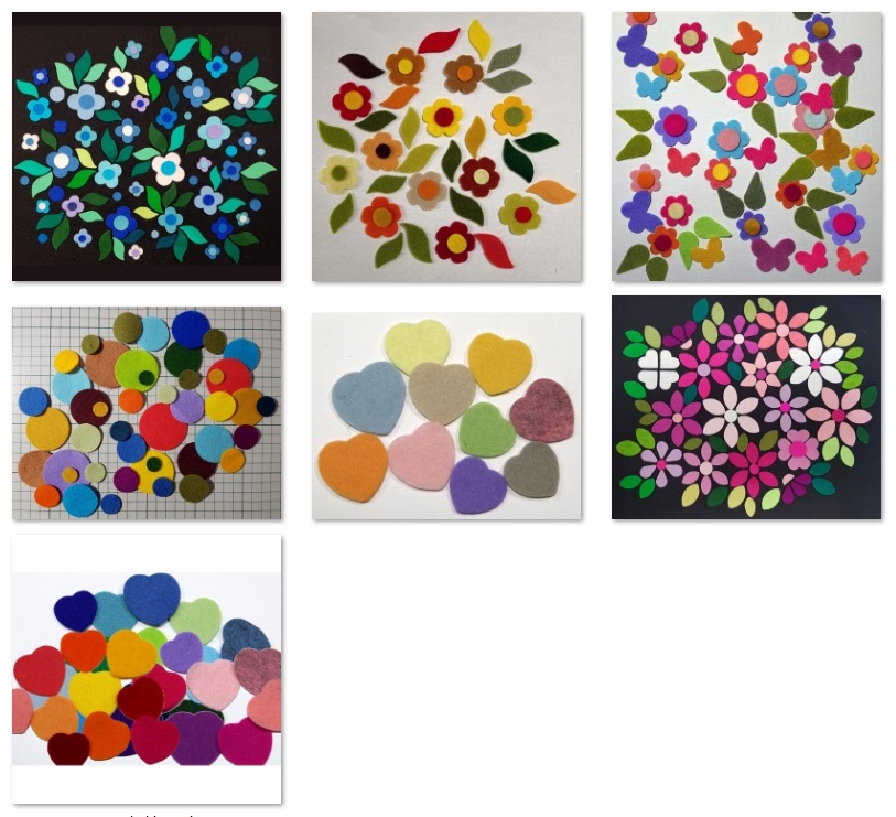 De olika formerna är stansade ur ullfilt av 100% ull, 1,2 mm tjock, oekotex-certifierad och brandsäker. Här finns blommor, blad, fjärilar, hjärtan, stjärnor, rundlar och snart också månar.