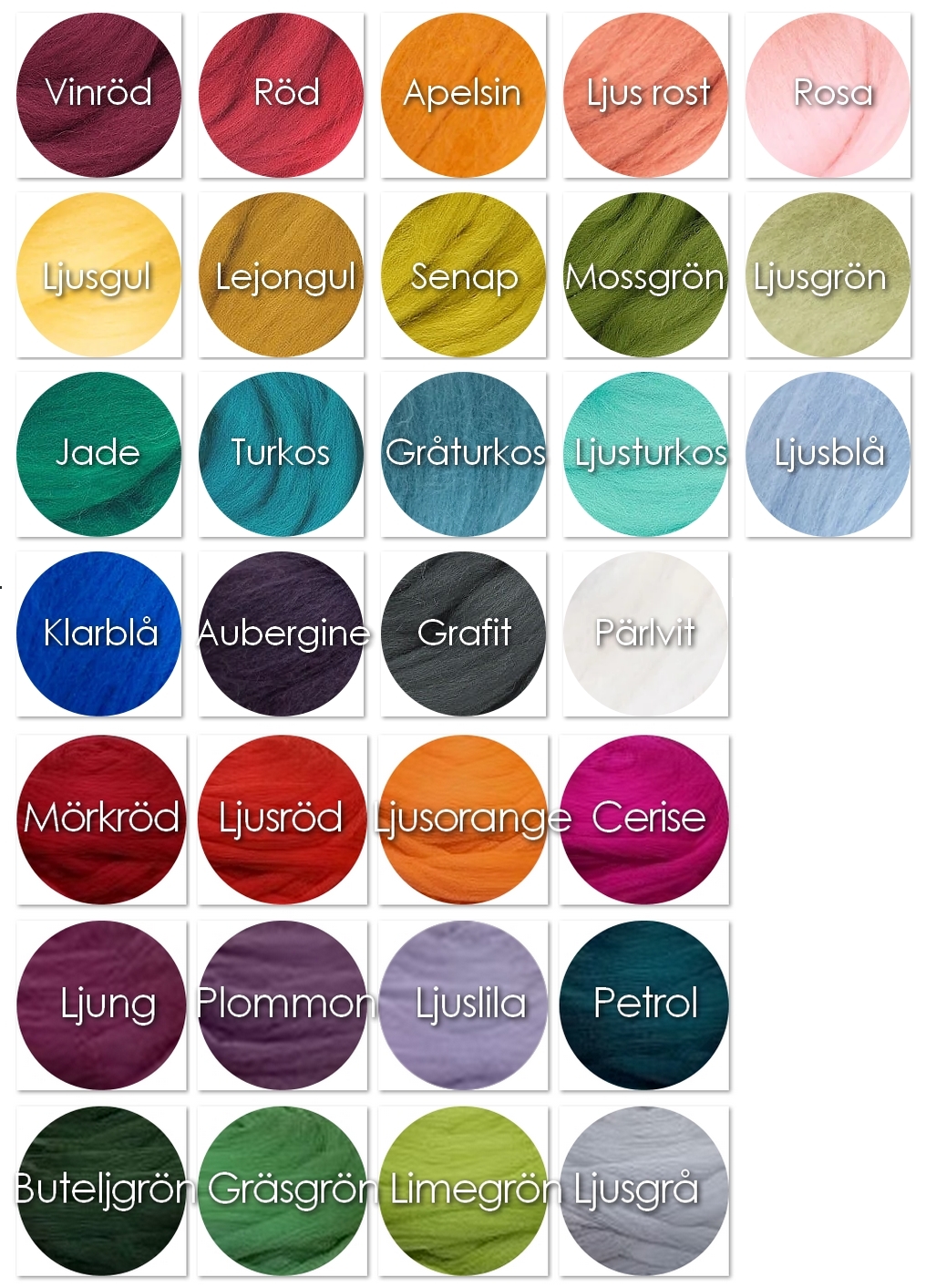 Fin tovningsull från merinofåret. Finns i många olika färger och säljs i påsar med 30 g.