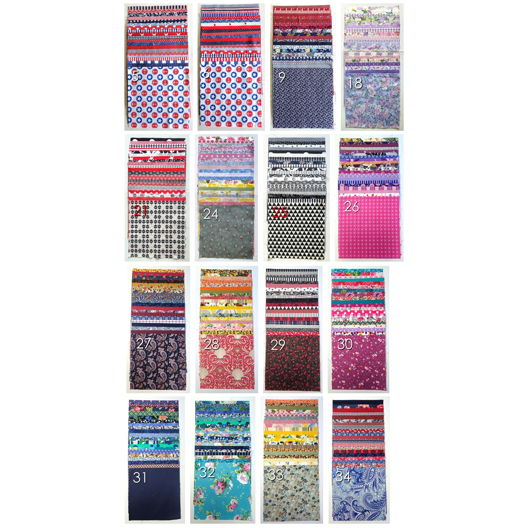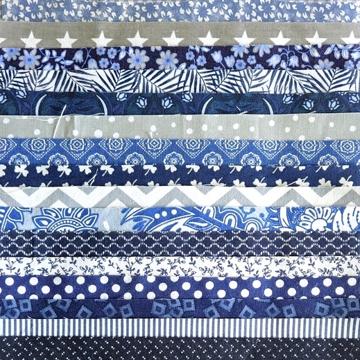 Färgmatchad bunt med 20 tygbitar, ca 20×20 cm, av fin bomull eller i ett fåtal fall bomull/polyester av bra kvalitet. Smidig poplin, quilttyg eller annan slätvävd kvalitet lämpade för t.ex. lappteknik.