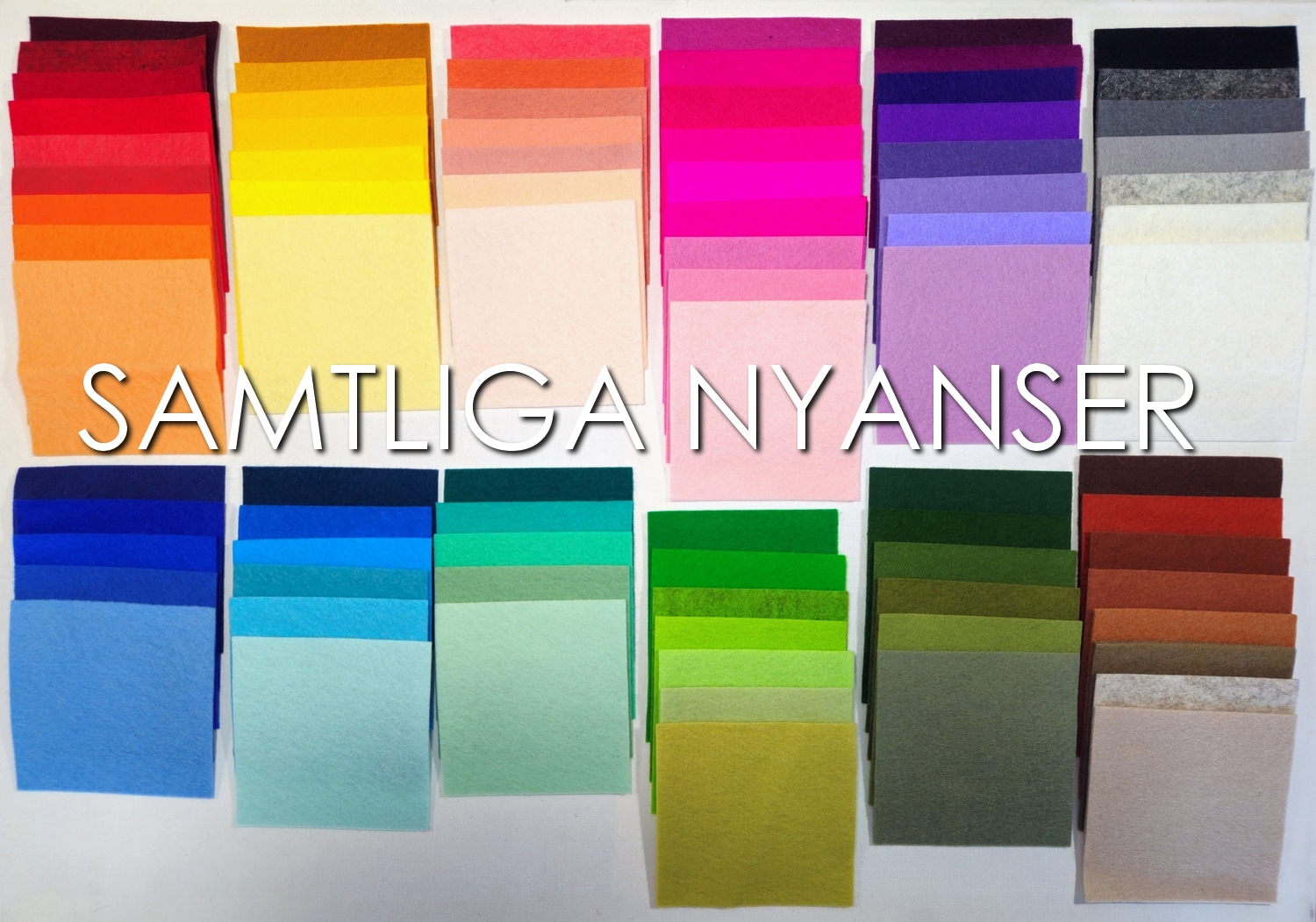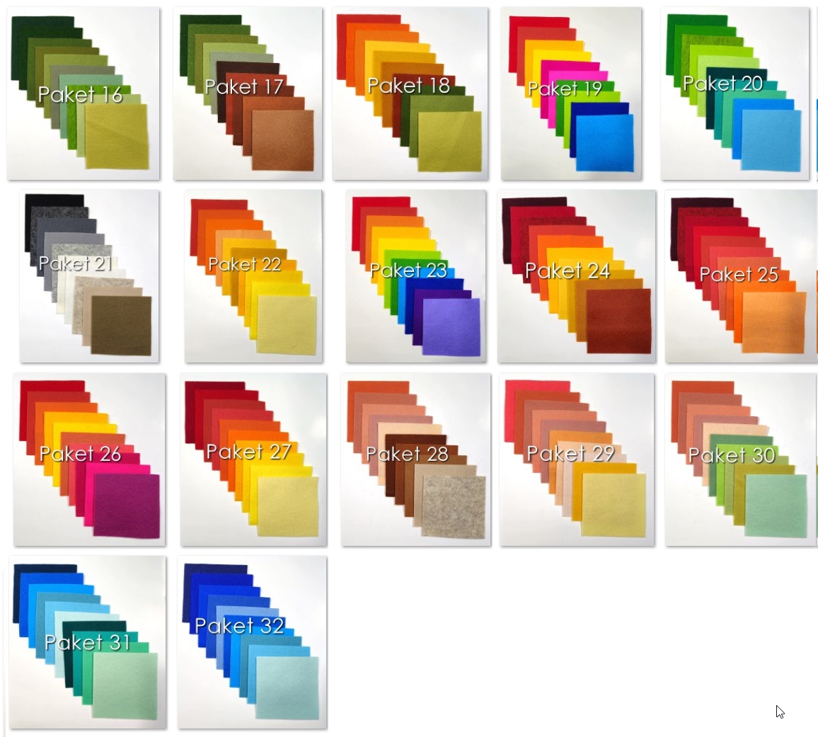 | Färgkombination | Nyheter, 01 Röd/orange/cerise, 02 Grön/turkos/blå, 03 Röd/orange/gul, 04 Vinröd/rosa/lila, 05 Grön/gul/rost, 06 Vinröd/rosa, 07 Rost/grön/gul, 08 Turkos/blå/lila, 09 Grön/rost/gul, 10 Allmogefärger, 11 Lila/rosa/turkos, 12 Blå/turkos/lila, 13 Blå/turkos/mint, 14 Cerise/rosa, 15 Cerise/rosa/lila, 16 Dämpat grön, 17 Grön/brun, 18 Höstfärger, 19 Klara färger, 20 Klargrön/mint/turkos, 21 Neutrala nyanser, 22 Orange/gul, 23 Regnbåge, 24 Röd/orange/gul/brun, 25 Röd/orange, 26 Röd/orange/cerise, 27 Röd/orange/gul, 28 Terrakotta/brun, 29 Varmrosa/lax/ljusgul, 30 Terrakotta/mjukt grön, 31 Turkos/mint, 32 Blå/turkos |