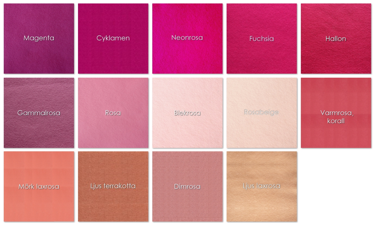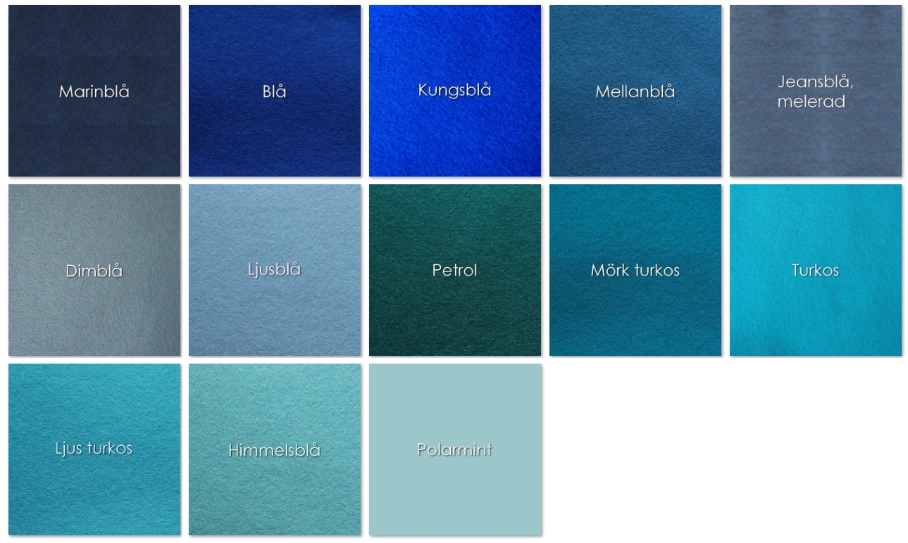 | Färg | Vinröd, Mörkröd melerad, Mörkröd, Röd, Tomatröd, Mörk orange, Orange, Ljus orange, Laxrosa, Persika, Ljusgul, Citrongul, Gul, Solgul, Senap, Kycklinggul, Senap melerad, Varmrosa, Mörk laxrosa, Ljus terrakotta, Ljus laxrosa, Dimrosa, Rosabeige, Aubergine, Cyklamen, Neonrosa, Magenta, Fuchsia, Hallonröd, Gammalrosa, Rosa, Blekrosa, Rosa melerad, Mörklila, Lila, Blålila, Syren, Rödlila, Rosalila, Marinblå, Kungsblå, Blå, Mellanblå, Jeansblå melerad, Dimblå, Ljusblå, Petrol, Mörk turkos, Turkos, Ljus turkos, Himmelsblå, Polarmint, Jade, Mörk mintgrön, Gräsgrön, Mintgrön, Mörkgrön, Klargrön, Sommargrön, Grön melerad, Äppelgrön, Ljusgrön, Limegrön, Mörk bladgrön, Bladgrön, Grön, Vårgrön, Gulgrön, Grågrön, Dimgrön, Sand, Guldbrun, Potatisbrun, Björnbrun, Varmbrun, Oxbrun, Kanelbrun, Rödbrun, Vit, Naturvit, Grå, Mellangrå, Ljusgrå melerad, Mörkgrå melerad, Svart |
